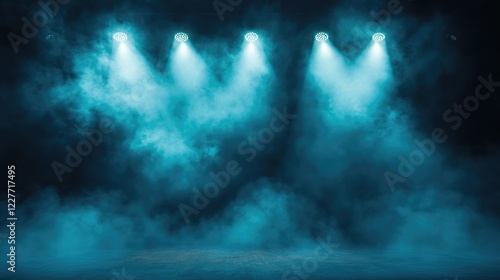Theatrical Stage with Dramatic Blue Fog and Bright Spotlight Beams Creating an Atmospheric Setting for Performance or Presentation