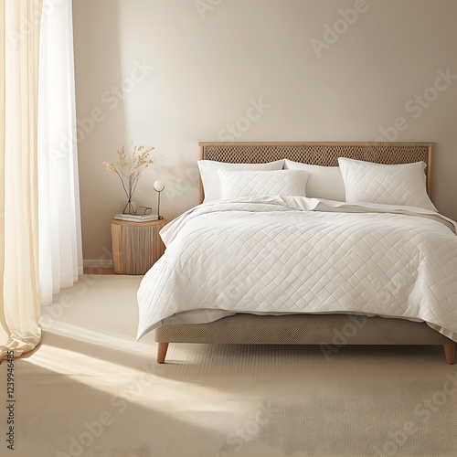 there is a bed with a white comforter and pillows in a room