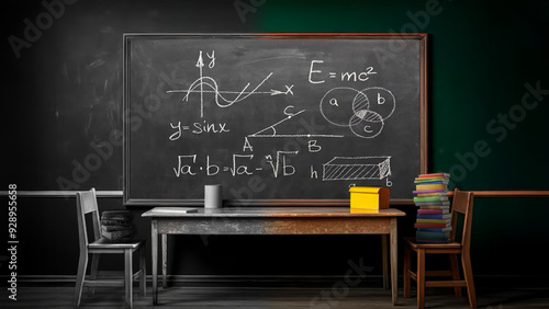 There is a classroom with a blackboard in the centre and a table in front. There are two chairs on each side with piles of books. The left side is black-and-white, and the other is coloured.