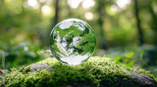 There is a glass ball on the grass in the forest