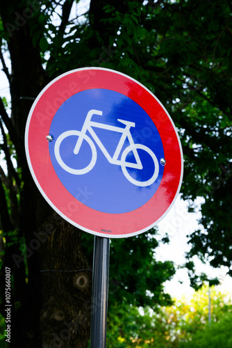 There is a striking red and blue sign prominently displayed that features an illustration of a bicycle on it, symbolizing cycling safety