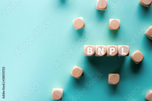 There is wood cubes with the word BNPL. It is an abbreviation for Buy Now, Pay Later as eye-catching image.