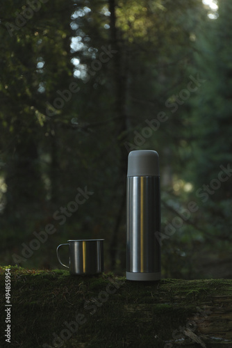 Thermos and cup on log in forest