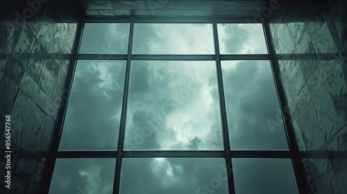 Thick glass square interior window with light dark background and clouds visible