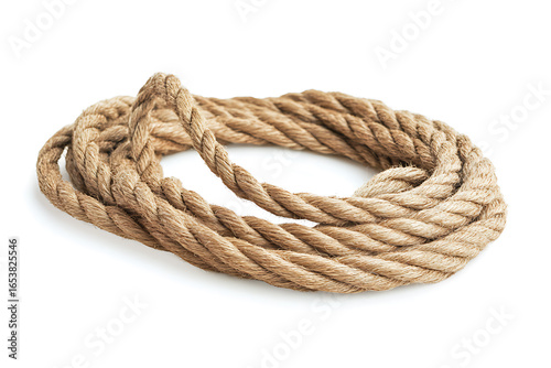 Thick natural fiber rope coiled on a white background
