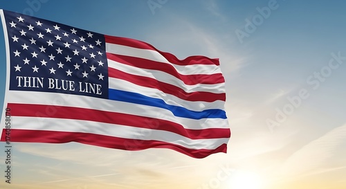 Thin Blue Line American Flag Waving in a Clear Sky Supporting Law Enforcement