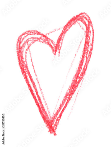 Thin elongated bright red heart hand drawn in bright colored pencils on clean white background