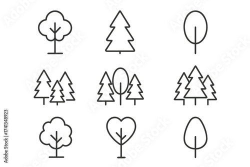 Thin Line Tree and Forest Icons Vector Set. Editable Stroke, Minimal Outline Style. Nature, Landscape, Ecology, Environment, Woods, Pine, Oak, Heart, Transparent Background, Web, Cards, Books, Apps.
