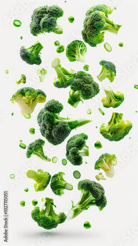 Thin round Broccoli vegetables slices flying in the air isolated on white background