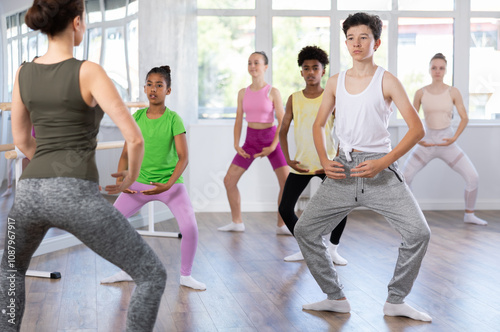 Thin teenage boy practicing plie position of ballet standing in row with others in dance-studio