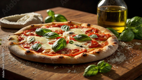 Thin-crust pizza with fresh tomato sauce, mozzarella, and basil, served on a wooden board with olive oil and Parmesan