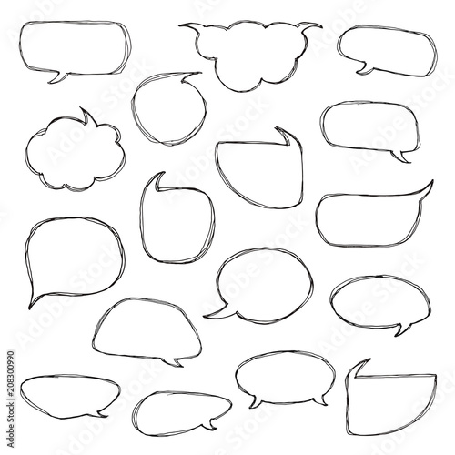 Think talk speech bubbles. Artistic collection of hand drawn doodle style comic balloon, cloud and heart. Vector illustration in sketch style.