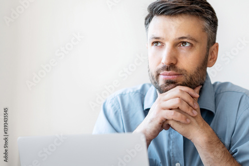 Thinking About Business Plan. Pensive Young Businessman Working On New Project In Office, Sitting At Workplace With Thoughtful Face Expression