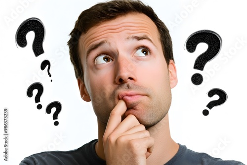 thinking man with puzzled expression and with question marks around him