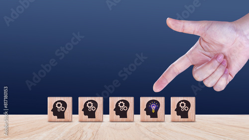 Thinking skills for business leader and manager concept. creative, systematic thinking skill, Hand business picked wooden cube block with head human symbol and light bulb icon creative idea concept.