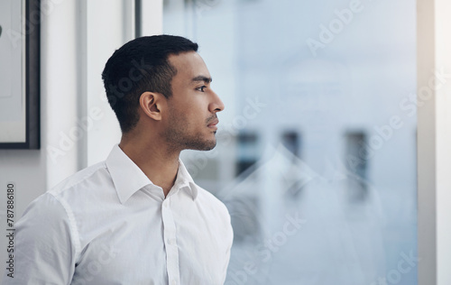 Thinking, window and profile of businessman in office with planning, brainstorming or decision face. Choose, ideas and professional male financial advisor with question facial expression in workplace