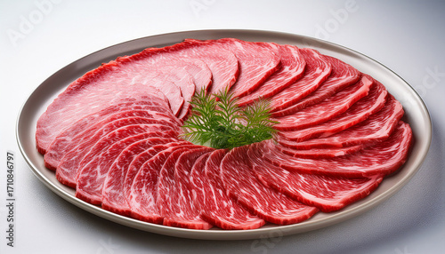 Thinly Sliced Wagyu Beef Arranged In Circular Layers On A Chilled White Plate