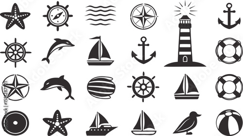 Thirty Solid Black Glyph Icons Nautical Theme Sea Ocean Maritime Symbols Sailing Ships Boats Anchors Dolphins Starfish Life Preservers