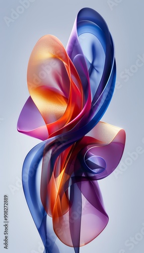 This abstract 3D rendering features vibrant twisted shapes in orange, blue, and purple hues on a pastel blue background. Ideal for websites, posters, and digital presentations.