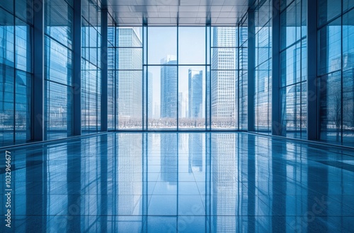 This abstract view of a city skyline, featuring sleek glass high rises illuminated by sky colors, evokes a sense of modernity and urban progress