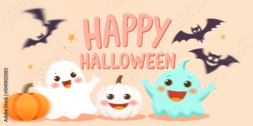 This adorable illustration features friendly ghosts, a smiling pumpkin, and playful bats, perfect for Halloween greetings and festive designs.