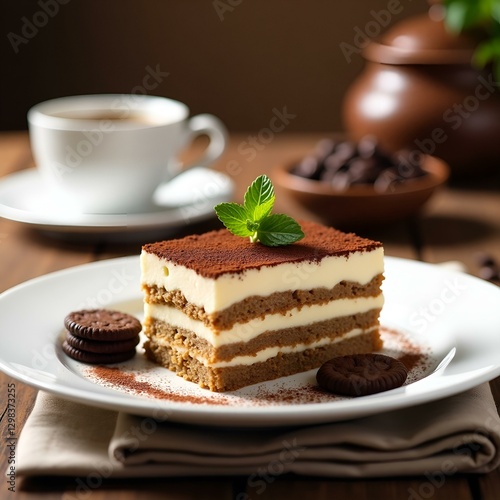 This AI-generated image is a high-resolution close-up photo of a dessert plate with a slice of tiramisu. The tiramisu is rectangular, with layers of cream and coffee-soaked sponge cake clearly visible