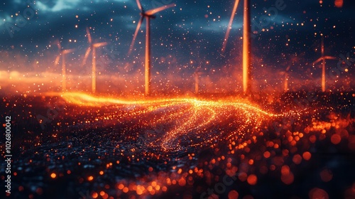 This artistic depiction features glowing sparks and illuminated wind turbines against a dramatic sky, creating a sense of energy and nature's beauty.
