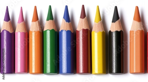 This artwork features an array of bright crayons and pencils lined up neatly against a pristine white background, showcasing a palette of colors ideal for creative projects