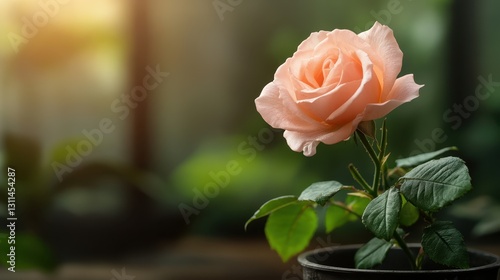 This captivating peach rose stands in a stylish plant pot, symbolizing love and beauty, beautifully captured against a background of vibrant greenery.