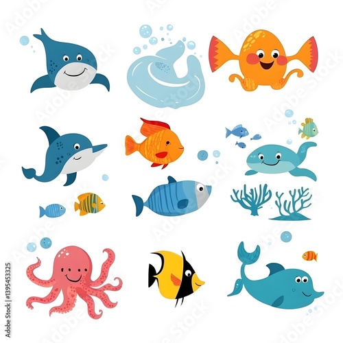 This charming collection of cartoon underwater creatures showcases a vibrant and playful scene featuring a friendly dolphin a whimsical octopus a serene sea turtle