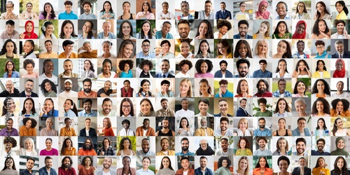 This collage showcases a collection of diverse individuals from various backgrounds, all wearing smiles and expressing joy in a lively atmosphere. Each face reflects the richness of diversity.