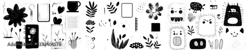 This collection includes cute hand-drawn labels with frames, numbers, calendar elements, and various modern decorative elements in a range of colors