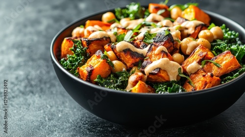 This colorful gourmet bowl showcases roasted sweet potatoes and chickpeas, with refreshing greens drizzled with tahini sauce, highlighting a healthy lifestyle.