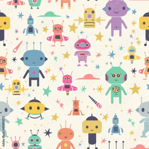 This colorful pattern features a variety of cartoon robots and aliens in various poses. They are all set against a white background with stars and clouds. The robots and aliens are all smiling and loo