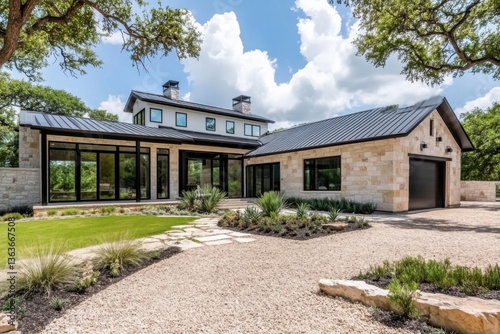 This contemporary house design showcases expansive windows and a beautiful natural stone facade, all set against a picturesque landscaped garden on a sunny day