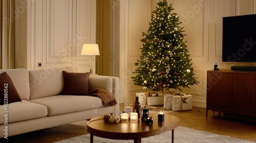 This cozy living room exudes holiday charm with a beautifully decorated Christmas tree, a warm fireplace, and soft lighting creating an inviting atmosphere perfect for gatherings