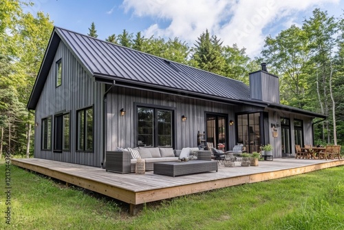 This cozy modern cabin, nestled among lush greenery, boasts a spacious deck that provides the ideal setting for outdoor relaxation and enjoyable gatherings