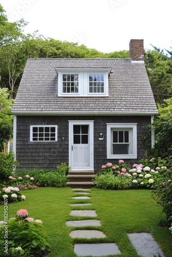 This delightful cottage is nestled in a peaceful residential area, adorned by a vibrant garden filled with blooming hydrangeas, perfect for a sunny day retreat
