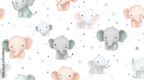 This delightful pattern features cute baby elephants in pastel pink, grey, and sage green against a white background adorned with polka dots, ideal for playful creations SEAMLESS PATTERN