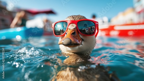 This delightful photograph shows an adorable duck swimming with red sunglasses, capturing the essence of summer fun and the playful side of wildlife in a bright environment.