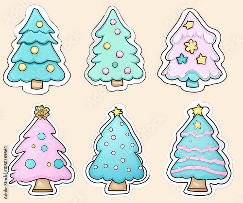 This delightful sticker set showcases six charming Christmas tree designs in pastel hues, perfect for adding a festive touch to holiday cards, gifts, and crafts