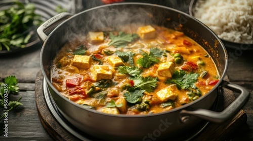 This dish features a vibrant vegan coconut curry packed with tofu, fresh vegetables, and aromatic herbs. It’s served warm alongside fluffy rice, perfect for a wholesome meal