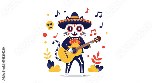 This engaging flat design vector illustration showcases a cheerful cat skeleton musician, dressed in traditional attire, playing a guitar during a vibrant Day of the Dead parade.