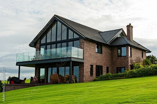 This expansive, modern house features a spacious glass balcony that offers stunning views of a beautifully manicured lawn, all set against a tranquil landscape under a cloudy afternoon sky