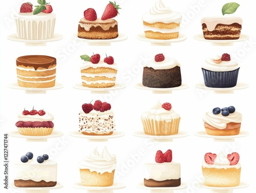 This flat design showcases an assortment of delectable cakes cupcakes and other baked desserts displayed in a visually appealing arrangement The image highlights the textures colors