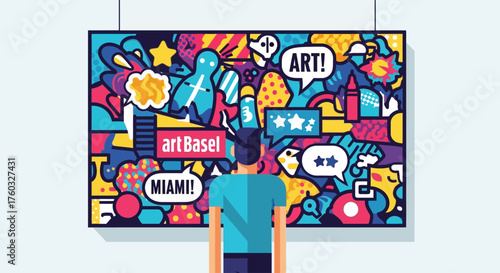 This flat design vector illustration showcases a bold, pop art-inspired piece at Art Basel Miami Beach, reflecting the event's vibrant and diverse artistic offerings.