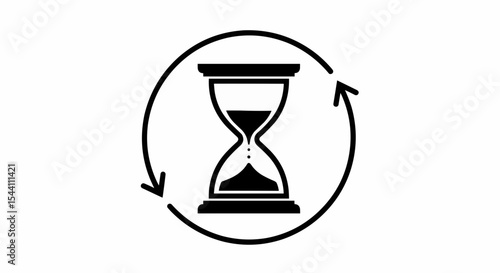This high-quality vector graphic features a thick black outline minimalist empty hourglass icon with concave sides and two encircling circular arrows, emphasizing time and fine details.