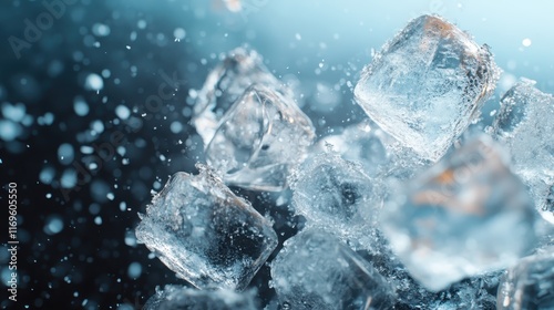 This high-resolution image captures sparkling ice cubes with droplets glistening against a blurred blue backdrop, highlighting their crystalline texture and coolness.
