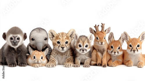 This illustration depicts a variety of animals including an elephant, giraffe, monkey, lion, and others, all gathered together on a clean white background, celebrating wildlife diversity