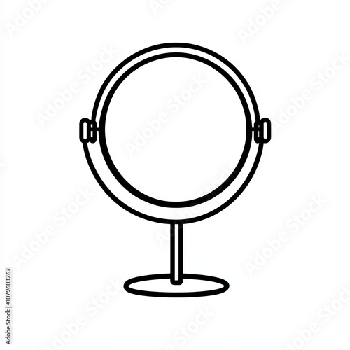 This illustration features a beauty mirror designed in a minimalist black and white style, showcasing a simplistic line interface on a plain white backdrop